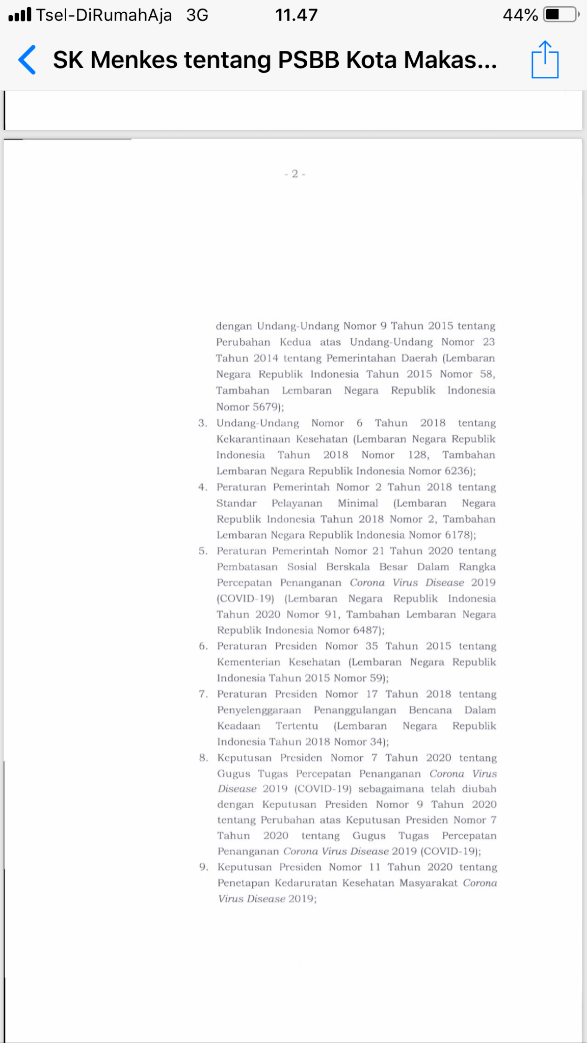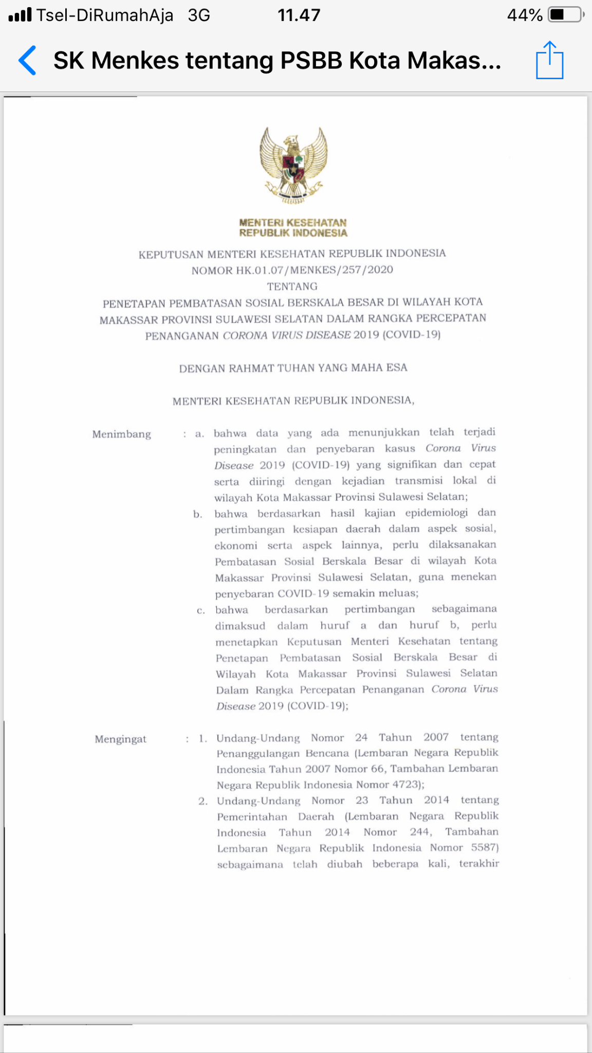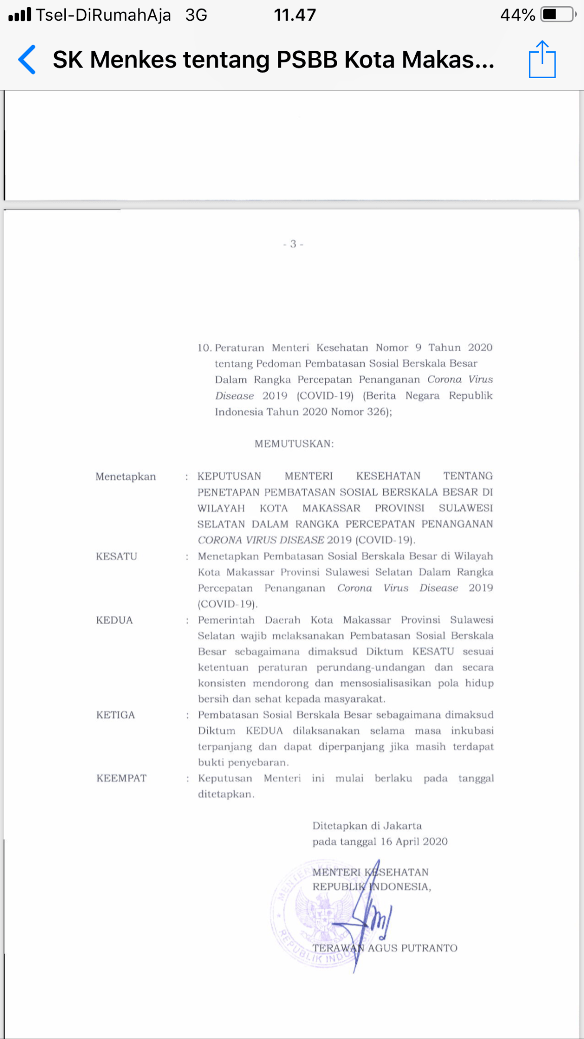 Keputusan tersebut diambil setelah Menkes RI menimbang beberapa hal, termasuk melihat perkembangan virus mematikan tersbut yang terus meningkat di Kota Makassar.