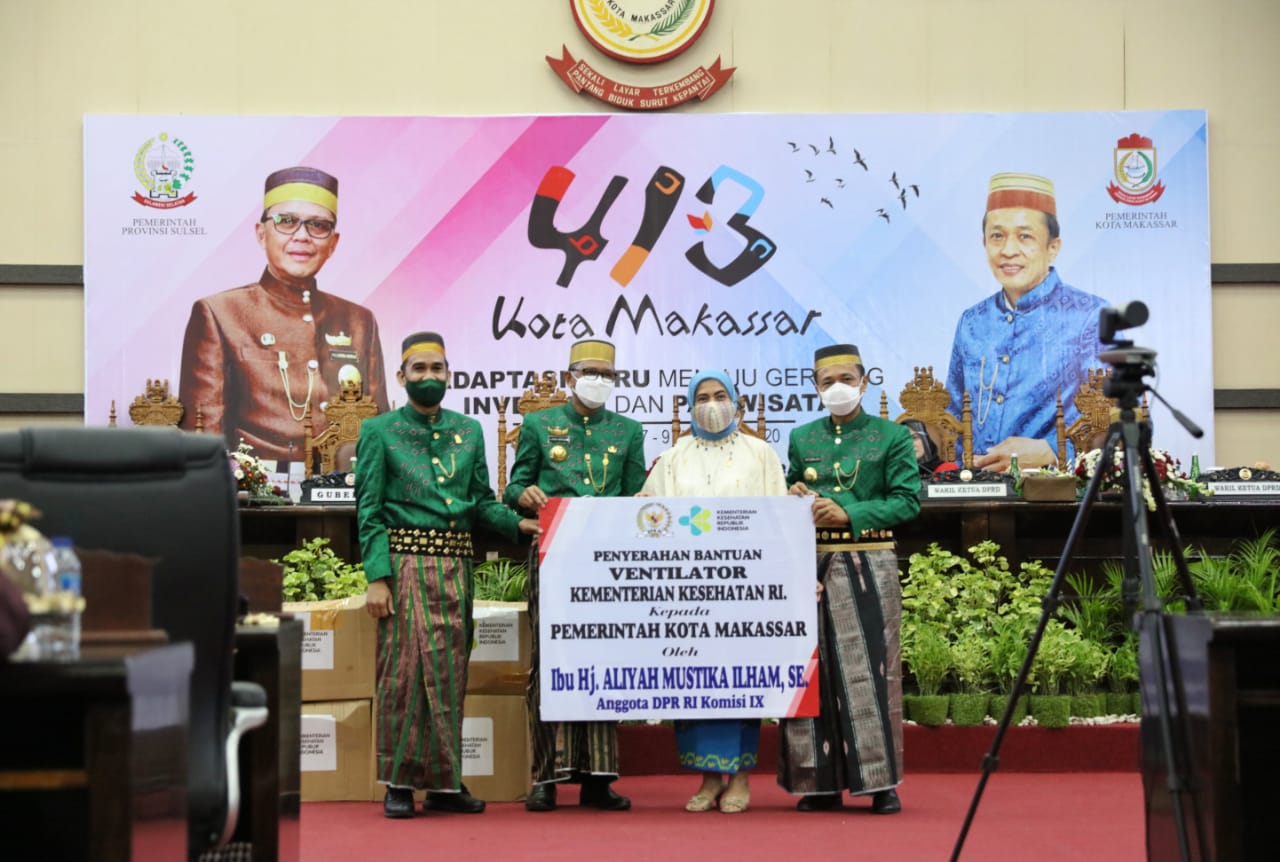 Di akhir acara peringatan ulang tahun Kota Makassar dilakukan penyerahan secara simbolis bantuan dari Kementerian Kesehatan RI yang diwakili oleh anggota DPR RI, Aliyah Mustika Ilham, kepada Pj Walikota Makassar, sejumlah ventilator sebagai upaya pemberantasan virus covid-19 di Kota Makassar. [As]