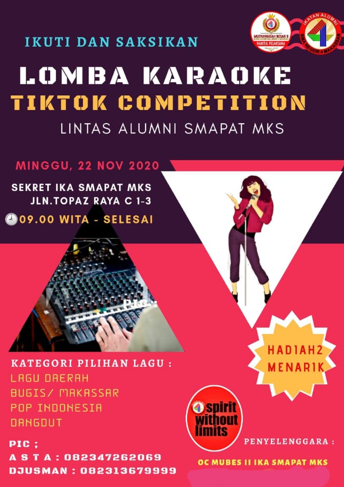 Untuk Lomba Karaoke dan Tiktok antar alumni angkatan akan berlangsung di Sekretariat IKA Smap4t jalan Boulevard Panakukang Mas Ruko Zamrud Blok C No. 1-3 hari Minggu (22 November 2020) mulai pukul 09.00 WITA. Adapun peserta lomba 42 orang dari berbagai angkatan.