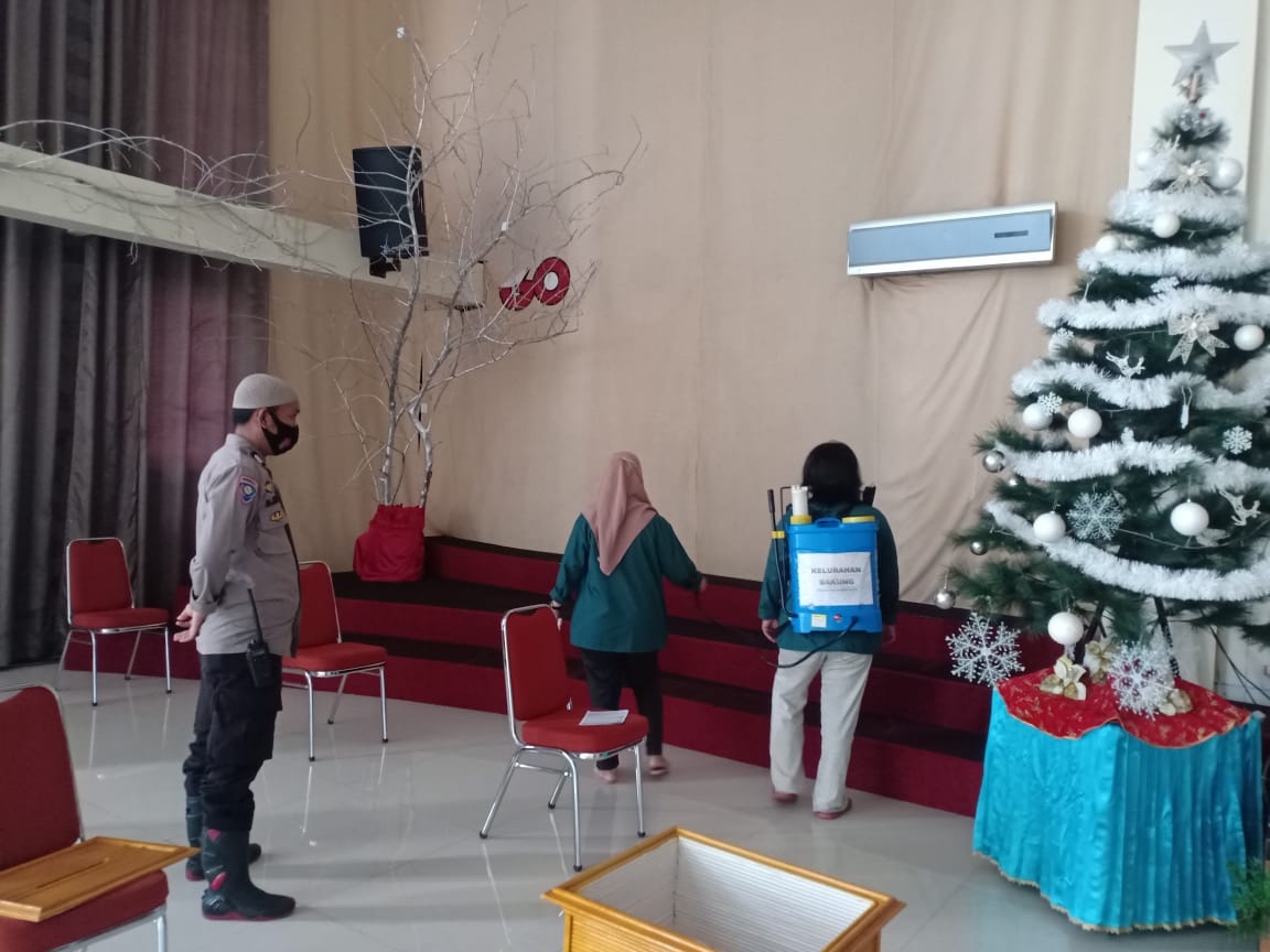 Brigpol Nurjaya Bhabinkamtibmas Bakung menuturkan bahwa kami bersama lurah Bakung berkomitmen untuk mengantisipasi penyebaran virus Covid 19 pada saat perayaan hari Natal tahun 2020 dengan cara mensterilkan tempat – tempat ibadah atau gereja yang ada di wilayah kelurahan Bakung dengan menggunakan cairan disinfektan.