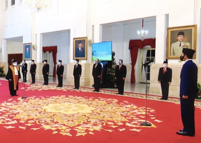Dailymakassar.id – Jakarta. Presiden RI Joko Widodo (Jokowi) menyaksikan pengucapan sumpah jabatan Andi Samsan Nganro sebagai Wakil Ketua Mahkamah Agung (MA) Bidang Yudisial, Senin (15/2/2021), di Istana Negara, Jakarta.