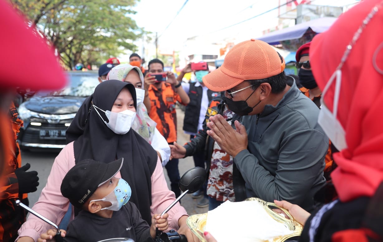 Dailymakassar.id – Makassar. Wali Kota Makassar, Moh. Ramdhan ‘Danny’ Pomanto membagikan masker kepada paengendara yang lewat di depan pasar Antang, Kecamatan Manggala, Minggu (15/8/21).