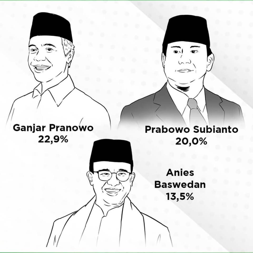 Dalam simulasi ada 15 nama Capres 2024 yang terjaring dengan angka elektabilitas dari setiap kandidat yaitu Ganjar Pranowo (22.9%), Prabowo Subianto (20.0%), Anies Baswedan (13.5%), Ridwan Kamil (4.1%), Agus Harimurti Yudhoyono (3.3%), Sandiaga Salahuddin Uno (2.8%), Khofifah Indar Parawansa (2.5%), Puan Maharani (1.9%), Gatot Nurmantyo (1.2%), Andika Perkasa (1,2%), Airlangga Hartarto (1.0%), Erick Thohir (0.9%), Mahfud MD (0.8%), Muhaimin Iskandar (0.3%) dan Zulkifli Hasan (0.2%).