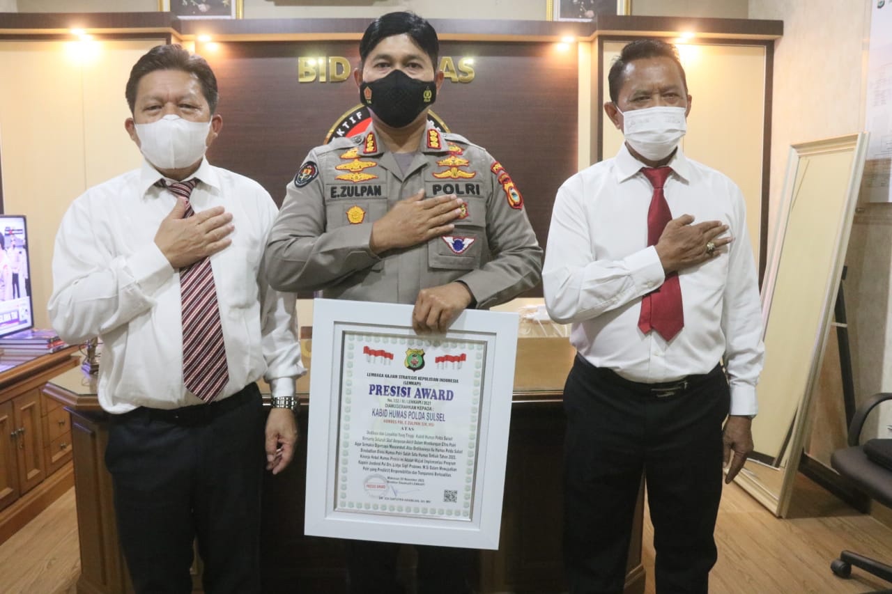 Penghargaan Presisi tersebut diberikan langsung oleh Direktur Eksekutif Lemkapi Dr. Edi Saputra Hasibuan, SH, MH., di Ruang Kerja Kabid Humas Polda Sulsel, Rabu 3 November 2021.