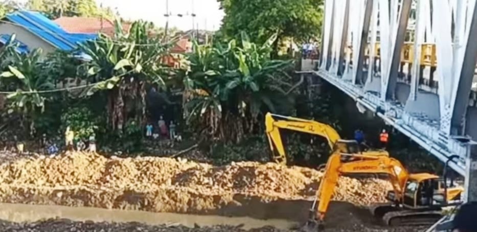 Adapun pelaksana kegiatan perbaikan ini yakni PT Hutama Karya (HK). Ada 3 alat berat excavator terlihat tengah melakukan pengerukan aliran sungai.