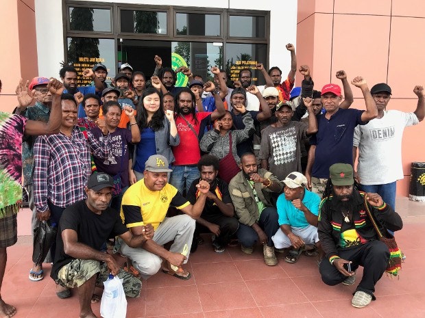 Veronica Koman (berdiri dengan kaos biru dan mengenakan blazer), pengacara dan aktivis isu-isu terkait hak asasi manusia di Papua, berfoto bersama warga Papua seusai sebuah persidangan di Timika, Papua, April 2019. Foto dok. Veronica Koman