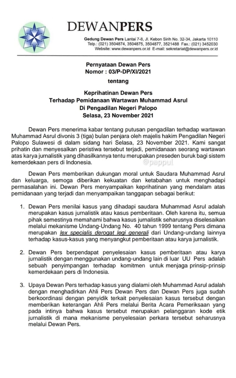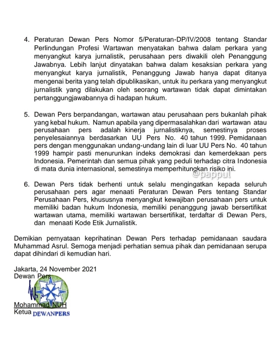 Adapun Dewan Pers telah mengeluarkan surat pernyataan tertanggal 24 November 2021, Nomor : 03/P-DP/XI/2021 tentang Keprihatinan Dewan Pers Terhadap Pemidanaan Wartawan, Muhammad Asrul.