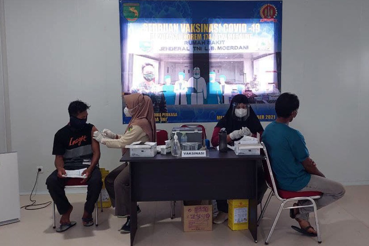 Dailymakassar.id – MERAUKE. Bertempat di RS. Jenderal TNI L.B. Moerdani Merauke Jln. Poros Tanah Miring, Kampung Kamangi, Distrik Tanah Miring, Kab. Meruake telah dilaksanakan kegiatan serbuan Vaksinasi Covid-19 di wilayah Korem 174/ATW dan video conference bersama Panglima TNI Jenderal TNI Andika Perkasa, S.E., M.A., M.Sc., M.Phil., Ph.D. secara virtual. Rabu (1/12/2021).
