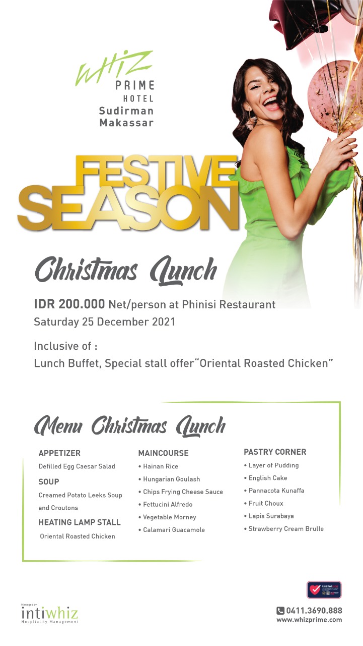 Dailymakassar.id – MAKASSAR. Menyambut Hari Raya Natal, Whiz Prime Sudirman Makassar (WPSM) menghadirkan Christmas Lunch di Phinisi Restaurant pada 25 Desember mendatang.