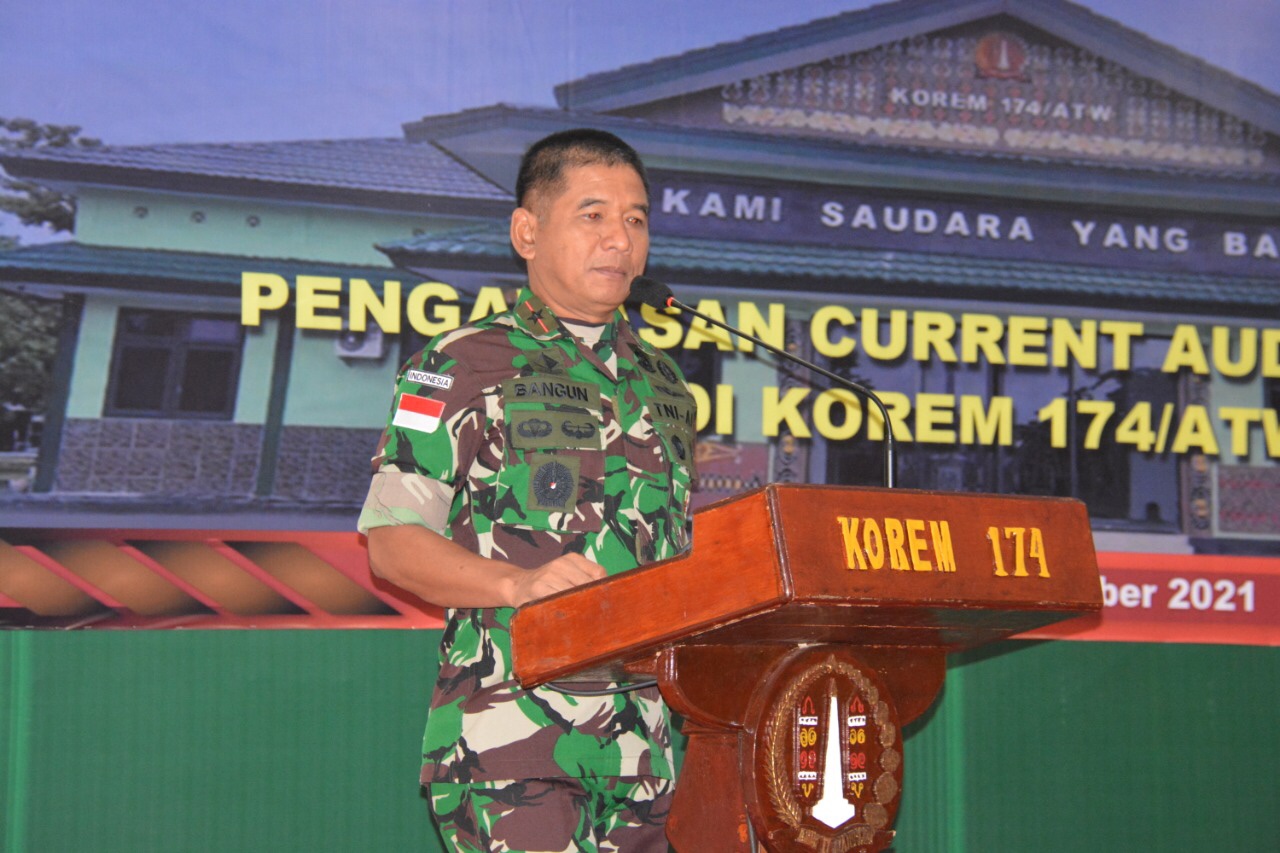 “Saya berterimakasih dengan adanya kegiatan Pengawasan Current Audit ini karena dapat menjadi sarana komunikasi dan pembelajaran terhadap kinerja Staf Korem 174/ATW dan jajarannya dalam hal ketaatan dan ketertiban administrasi pelaksanaan program kerja dan anggaran pada program yang sedang dilaksanakan”, katanya.