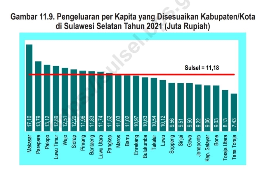 “Pada tahun 2021, terdapat 10 kabupaten/kota dengan nilai pendapatan perkapita disesuaikan lebih tinggi dari nilai provinsi yaitu Pangkep, Luwu Utara, Bantaeng, Pinrang, Sidrap, Wajo, Luwu Timur, Palopo, Parepare, dan Makassar,” tulis BPS.