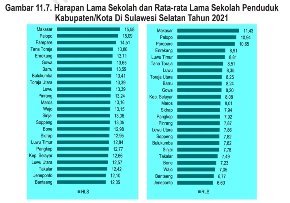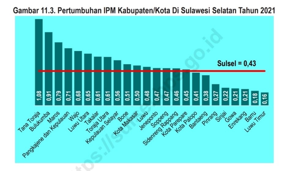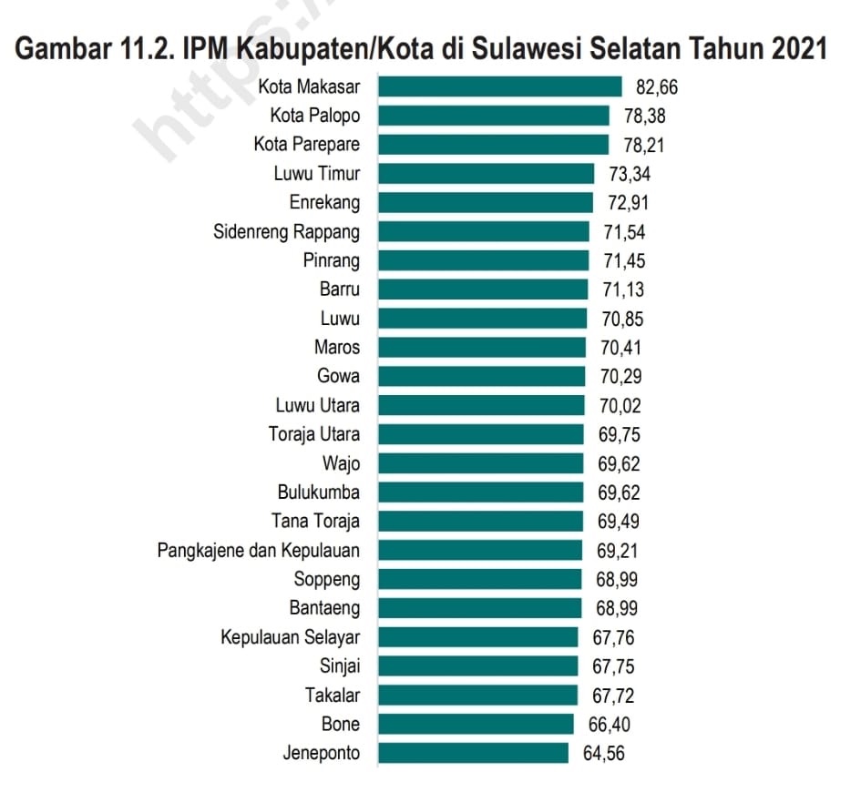 “Terdapat 12 kabupaten/kota yang termasuk kategori tinggi yaitu Kabupaten Gowa, Maros, Barru, Sidrap, Pinrang, Enrekang, Luwu Utara, Luwu Timur, Parepare dan Palopo. Sisanya, sebanyak 11 kabupaten masih dalam kategori IPM sedang,” sebut BPS dalam rilisnya.