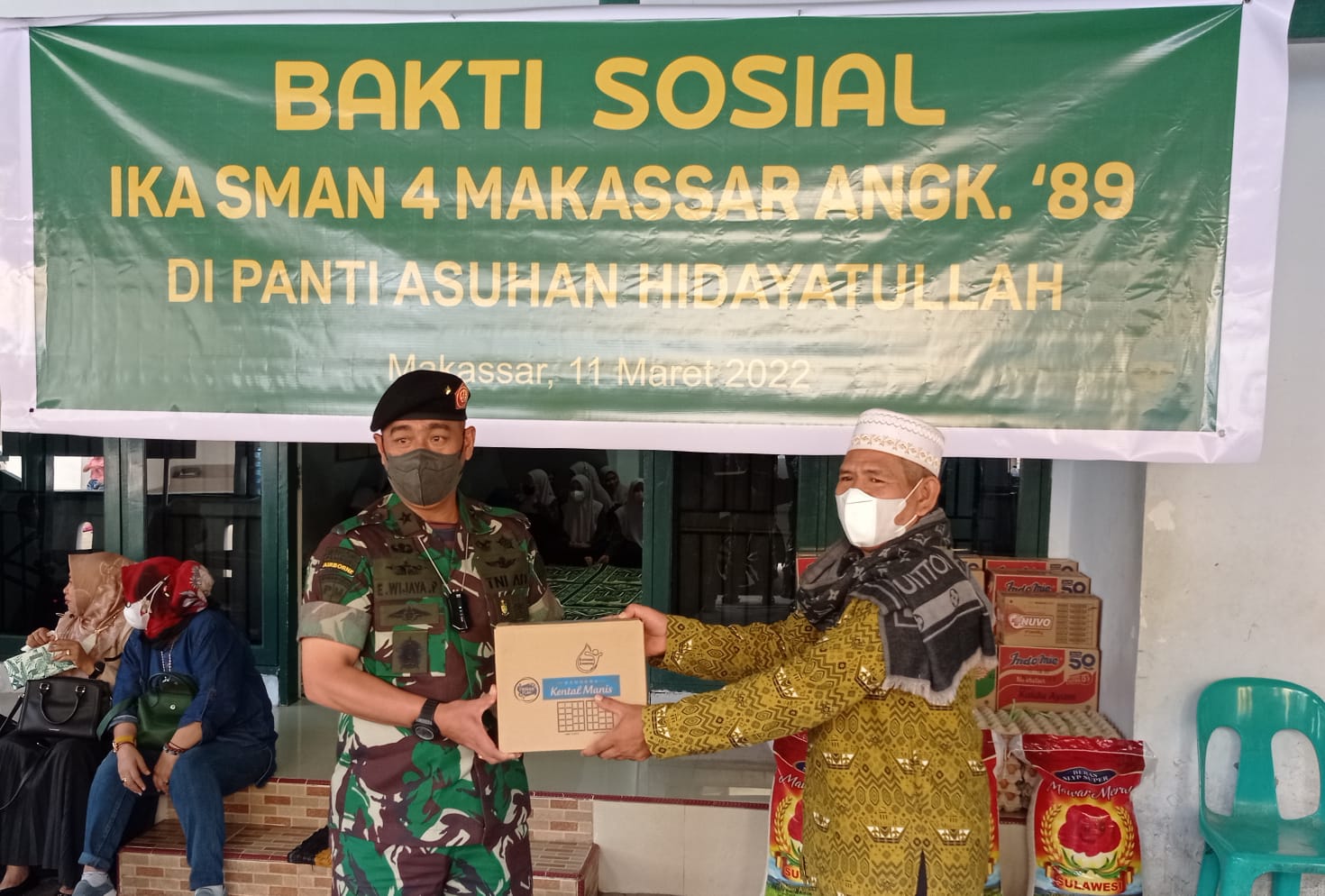 Di sana, IKA SMAN 4 Makassar Angkatan 89 membagikan sumbangan sembako ke Panti Asuhan Hidayatullah berupa, beras, gula, susu, telur, mie instan, sabun, dan odol. Sumbangan tersebut diserahkan secara simbolis oleh Brigjen Eka dan Ruslan (mantan Ketua OSIS Smapat 89) kepada pihak pengelolah Panti Asuhan**(RM)