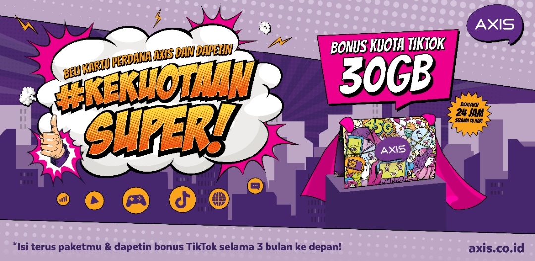 Alfons menambahkan selain Bonus kuota Tiktok 30GB, pelanggan baru AXIS juga akan mendapatkan beragam bonus-bonus lain, seperti Bonus 30GB Kuota Games dari jam 00.00-06.00 WIB dan Bonus 30GB Kuota Conference / Kuota Edukasi 00.00-24.00 WIB yang bisa dinikmati pelanggan hingga 2GB/hari berlaku hingga 15 hari terhitung sejak pemakaian pertama kartu perdana AXIS. Masih ada lagi, tambahan Bonus Nelpon ke semua nomor AXIS dan XL 200menit/hari dan Kuota Aplikasi untuk LINE, WhatsApp, Gojek, Ovo, Grab dan Google Maps 103MB/hari selama nomor aktif. Pelanggan juga bisa meredeem Bonus Sureprize 512MB tiap minggu di aplikasi AXISNET selama mereka memiliki paket internet minimal 7 hari dengan kuota utama yang aktif.