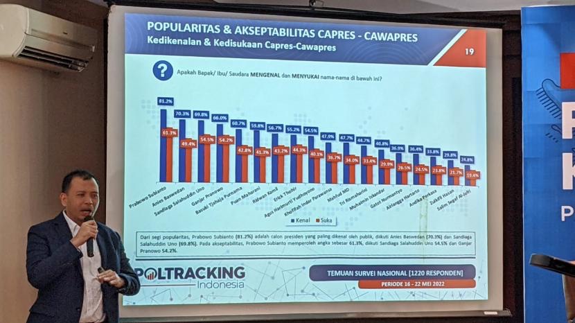 “Hal itu bila dilihat dari tingkat popularitas dan akseptabilitas capres-cawapres,” papar Direktur Eksekutif Poltraking Indonesia Hanta Yuda AR saat memaparkan hasil survei nasional ‘Proyeksi Kandidat Kuat Kandidasi Pilpres 2024’ di Jakarta Selatan, Kamis (9/6/2022).