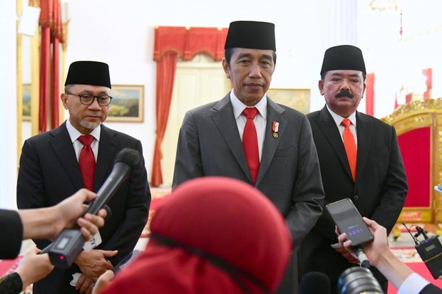 Presiden Joko “Jokowi” Widodo berbicara dengan awak media didampingi Zulkifli Hasan (kiri) dan Hadi Tjahjanto (kanan) sesaat setelah masing-masing dilantik sebagai Menteri Perdagangan dan Menteri Agraria dan Tata Ruang/Kepala Badan Pertanahan Nasional, di Istana Negara, Jakarta, 15 Juni 2022. [BPMI/Sekretariat Kabinet]