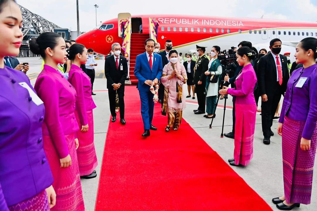 BANGKOK – Presiden Joko Widodo dan Ibu Iriana Joko Widodo tiba di Bandar Udara Suvarnabhumi, Bangkok, Thailand, Kamis, 17 November 2022. Setelah menempuh penerbangan selama hampir empat jam, pesawat kepresidenan yang membawa Kepala Negara dan rombongan tiba sekitar pukul 15.55 waktu setempat.