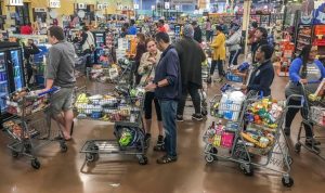 Seperti dalam situasi krisis misalnya krisis air mineral kemasan botol atau tisu toilet, sebagian dari mereka bergegas ke pasar swalayan untuk membeli persediaan pangan, memenuhi troli belanja mereka dengan berkarung-karung beras. Di beberapa lokasi, antrean mengular sampai ke luar toko ketika para konsumen berbelanja dengan panik.