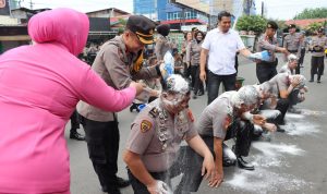 Personel Polres Pelabuhan Makassar yang memperoleh kenaikan pangkat tersebut, diwarnai tradisi siram air kembang warna dan penyiraman air dari kendaraan Water Cannon.