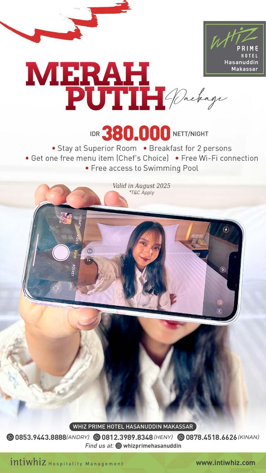 “Kami ingin mengajak para tamu merayakan bulan kemerdekaan dengan suasana yang hangat dan meriah. Promo ini merupakan wujud apresiasi kami atas semangat nasionalisme dan kebersamaan yang selalu hidup di tengah masyarakat Indonesia,” ujar Moch Ikhsan RF, General Manager Hotel Whiz Prime Hasanuddin Makassar.