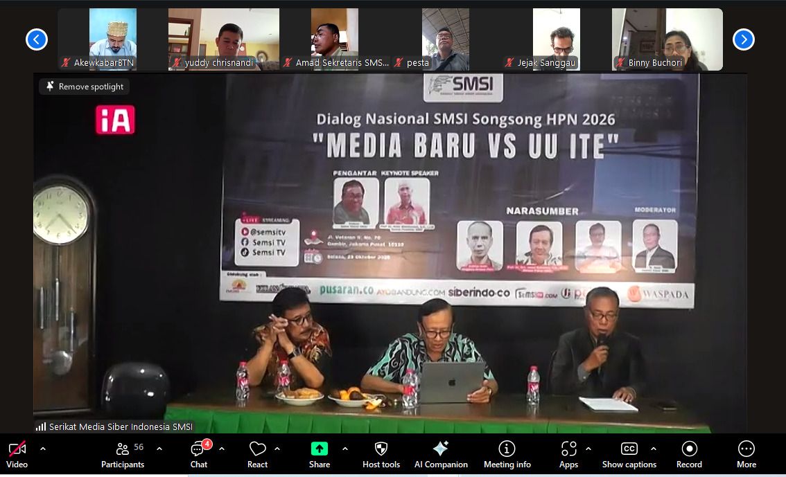 Dailymakassar.id—Jakarta. Serikat Media Siber Indonesia (SMSI) menggelar Dialog Nasional bertajuk “Media Baru vs UU ITE” di Kantor Pusat SMSI, Jalan Veteran II, Gambir, Jakarta Pusat, Selasa (28/10/2025).