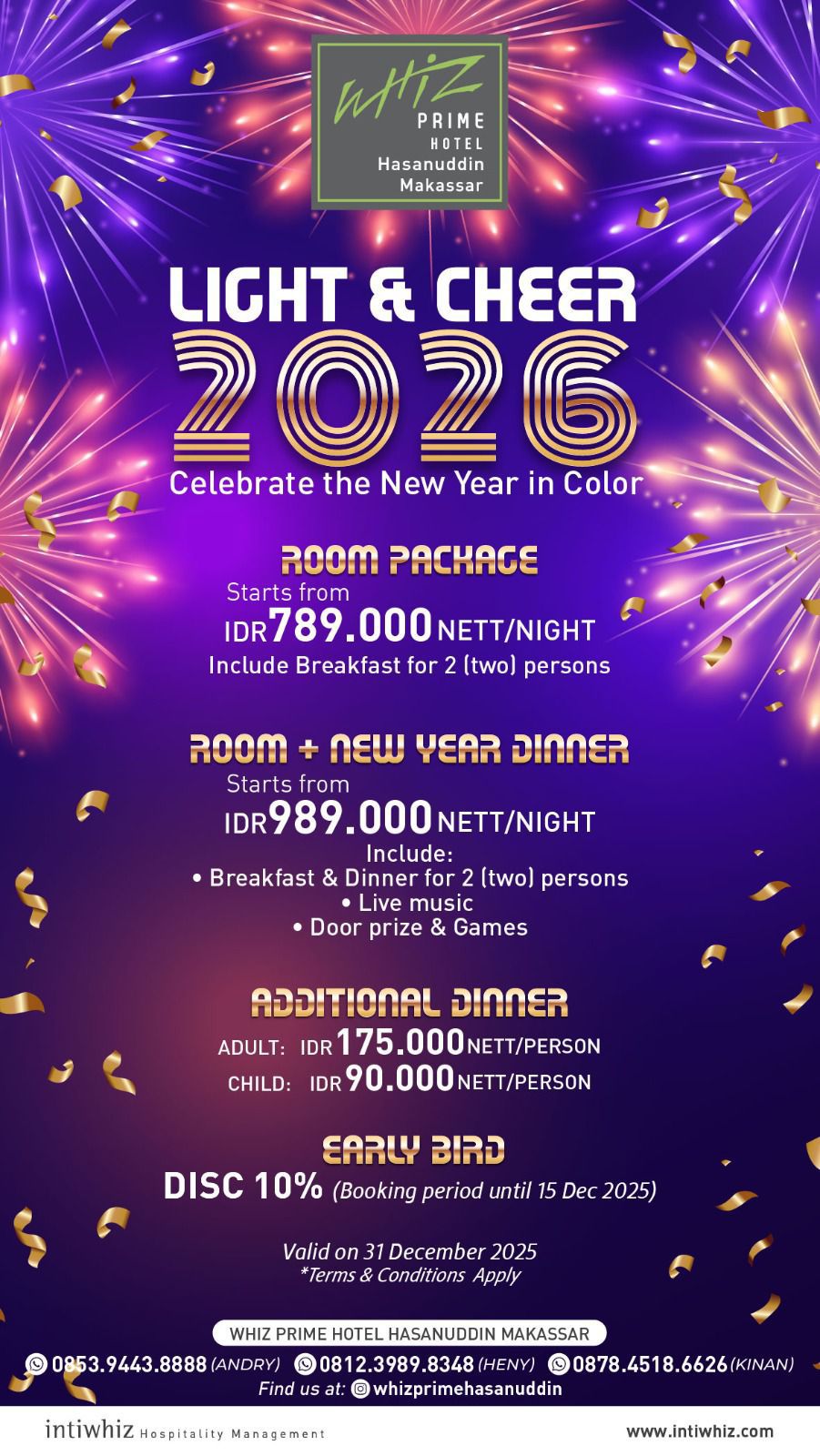 Dailymakassar.id—Makassat. Menjelang pergantian tahun, Whiz Prime Hotel Hasanuddin Makassar, yang berada di bawah pengelolaan Intiwhiz Hospitality Management, menghadirkan rangkaian perayaan malam tahun baru bertema “LIGHT & CHEER 2026.”